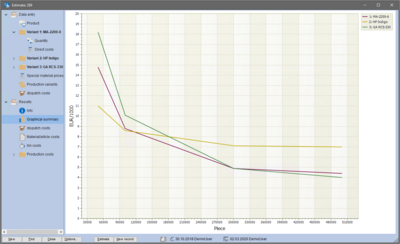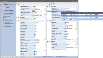 The built-in production-versions calculation allows multiple production versions, e.g. for different criteria, to be calculated and compared at the same time. Here, C3 simulates complete production e.g. in a digital roll and conventional sheet production to determine the optimal production method for each required quantity.